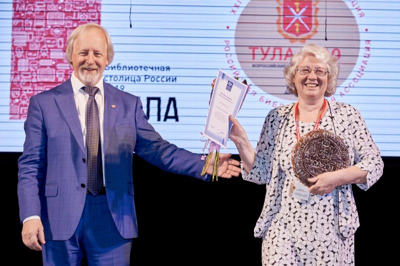 Президент РБА М. Д. Афанасьев награждает Почётной грамотой РБА заведующую отделом редкой книги и мемориальной работы Библиотеки-читальни им. И. С. Тургенева Е. В. Николаеву